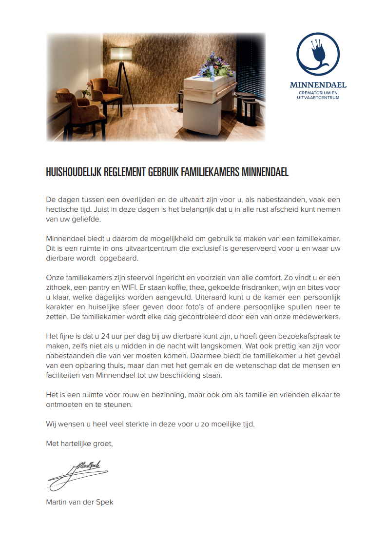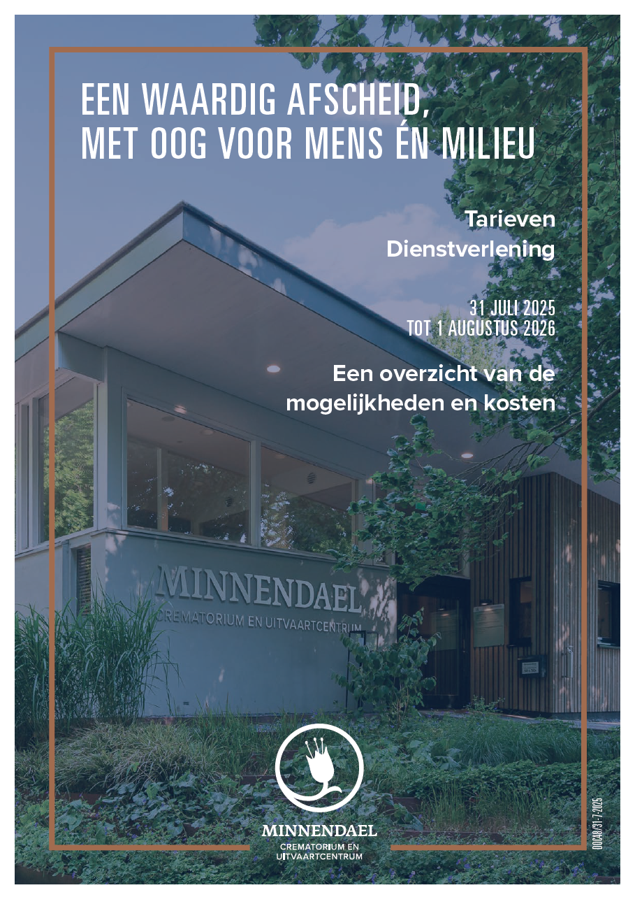 Als uitvaartondernemer kunt u gebruik maken van de locatie en alle faciliteiten van Crematorium Minnendael. Hieronder treft u onze brochure, tarievenlijst en huisregels. Hierin vindt u alle nodige informatie. Mocht u een uitvaart bij Crematorium Minnendael willen verzorgen, dan kunt u deze eenvoudig online aanmelden.
